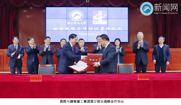 On the afternoon of April 23rd, the cooperation agreement signing ceremony was held in Lide Building. HNUST officially started school-enterprise strategic cooperation with Hunan Construction Engineering Group Co., Ltd (CHCEG) and “College to Undergraduate” cooperation with Hunan Urban Construction College (HNUCC). Cao Jiongfang, Secretary of Xiangtan Municipal Committee, Ye Xinping, Chairman of Hunan Construction Engineering Group, Liu Deshun, Secretary of the Party Committee of HNUST, and Zhu Chuanqu, President of HNUST attended the meeting, which was presided over by Hu Shiqi, Vice President of HNUST.