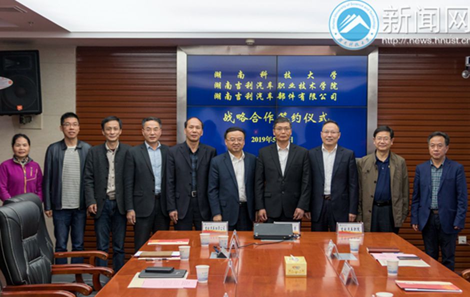 On May 7th, the signing ceremony of the strategic cooperation agreement was held in Lide Building to mark the strategic partnership among HNUST, Hunan Geely Automobile College (HGAC) and Hunan Geely Auto Parts Company (HGAPC), attended by Party Secretary of HNUST Liu Deshun, President Li Bochao and Vice-President Liao Xiangyue.